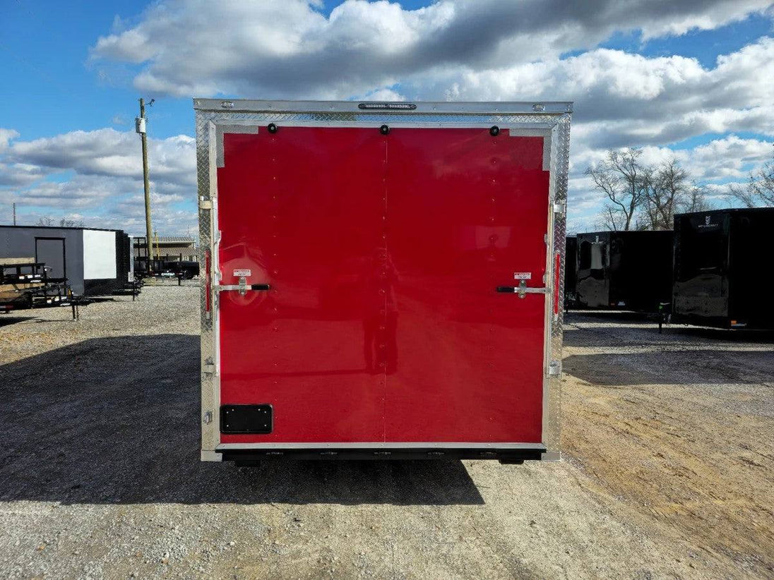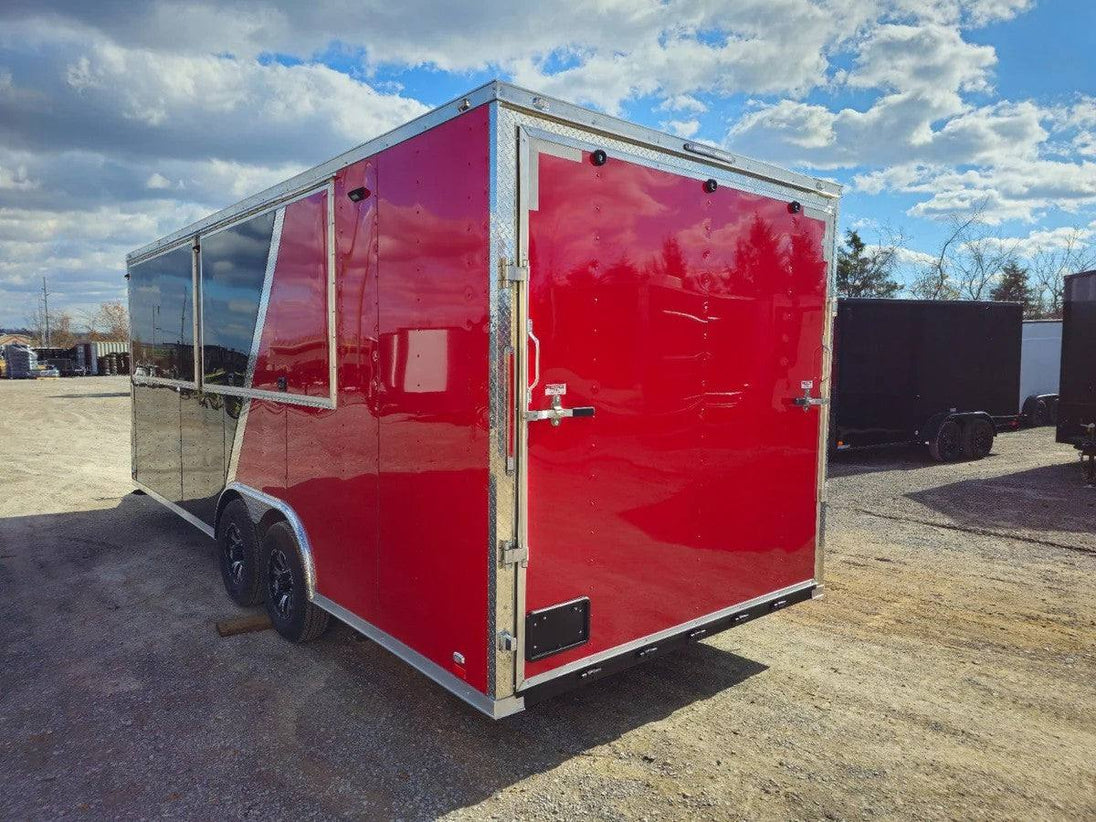 This trailer is a custom-designed enclosed trailer that offers a 50amp electric package, a wood interior, and has the sides of the trailer with half-wall flip-ups for open-air concept.
