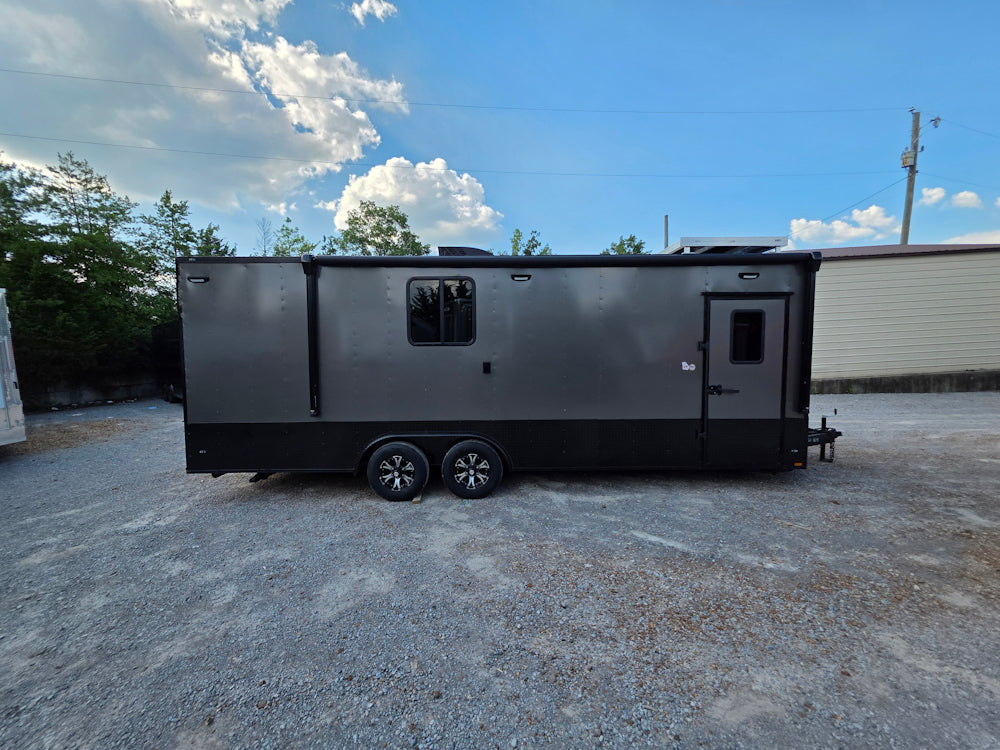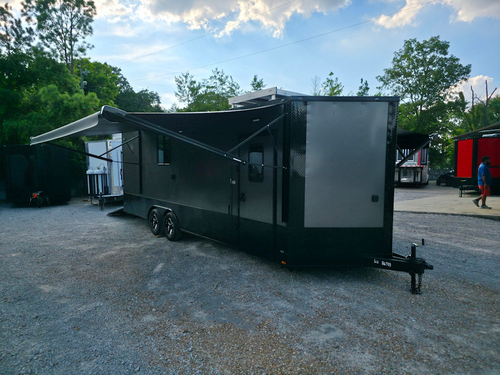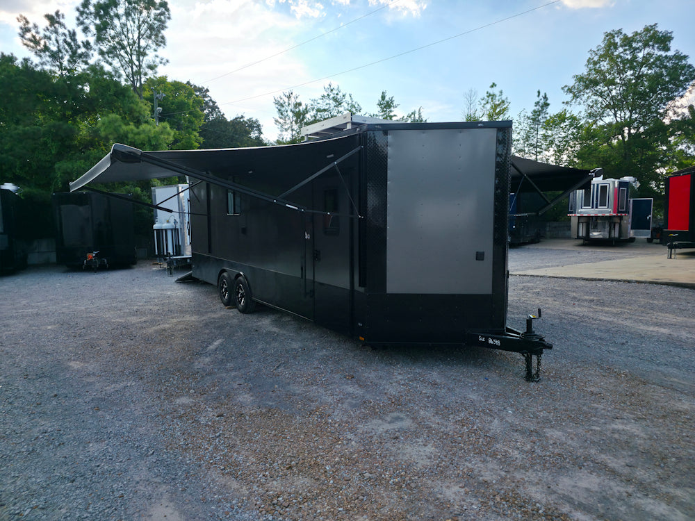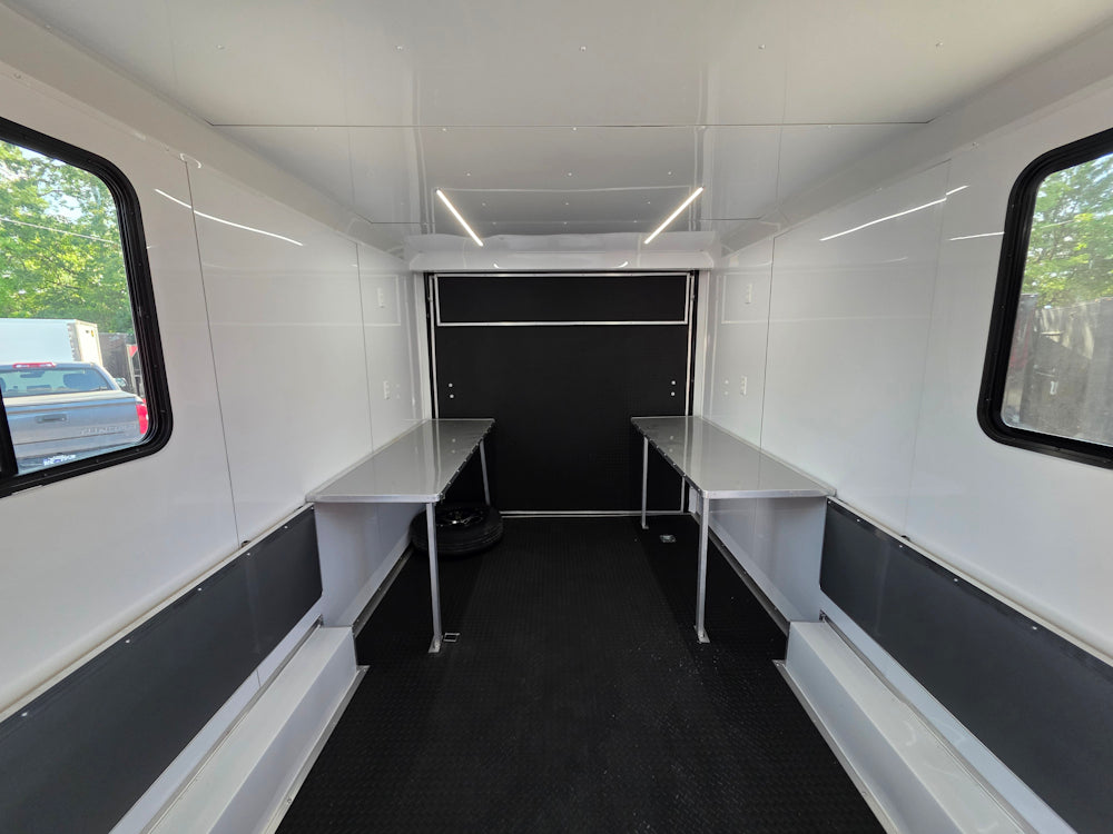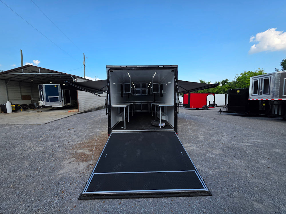 This 8.5' x 24' custom mobile command and office trailer is built for professional field operations, with a 7.5' interior height, dual 5,200 lb torsion axles, and a rear ramp door for easy access. It features a 100 Amp electric system, A/C and heat package, aluminum countertops, upper and base cabinets, and a 4' x 8' observation deck. Designed for versatility and durability, it’s ideal for emergency response, mobile offices, and tactical deployments.