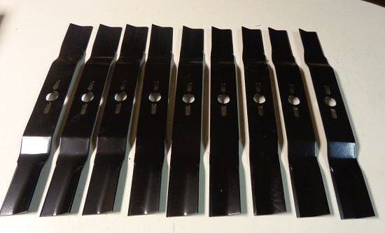 Set of 9, 20 inch lawn mower blades. Fits all, 1 inch center hole. Center hole fits 95% of all lawn mowers made.