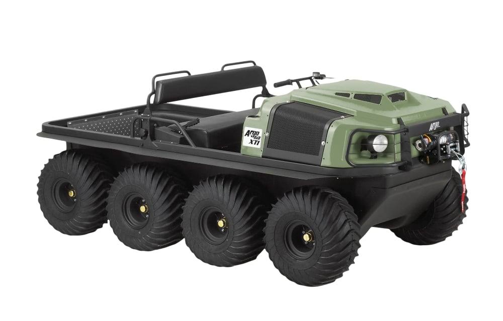 This Conquest 8x8 XTd amphibious ATV is powered by a 24hp Kohler Aegis engine and has a load capacity of up to 1340 pounds. This Argo can carry 4 people on land and 2 in the water.