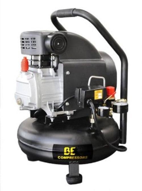 This is a BE Pressure 4 gallon horizontal compressor, model number AC204, that has a cast iron pump cylinder and an oil lubricated pump.