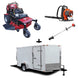 This package includes a 36 inch Bradley 36SC-CT25 zero-turn mower with a 25 horsepower Briggs and Stratton engine, one Husqvarna 130BT backpack blower, one 128LD straight-shaft string trimmer, and a 6x12 enclosed trailer.