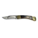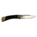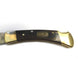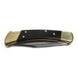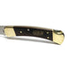 The classic 110 Folding Hunter has been made since 1964 making 2014 it's 50th Anniversary. When first made, it introduced Buck's breakthrough locking folder system which remains a mainstay in the line today. Today, it is one of the knife industries most imitated designs. The famous features of the 110 remain, such as the Macassar Ebony Dymondwood handle and brass bolsters. This commemorative version, which will be included on all Model 110s for 2014, features an anniversary medallion on the handle and custom blade stamp denoting 50 years. It also features a 3.75" clip point 420HC Stainless Steel Blade. It is 4.88" long closed and weighs 7.2 oz. and comes with a black leather sheath.