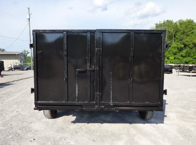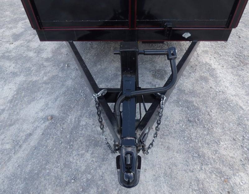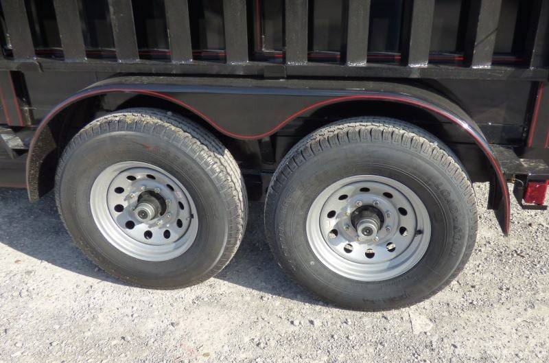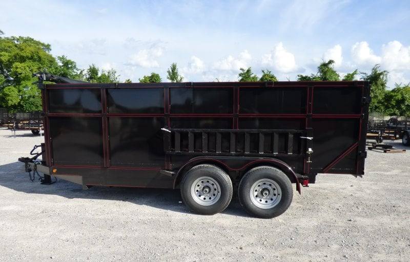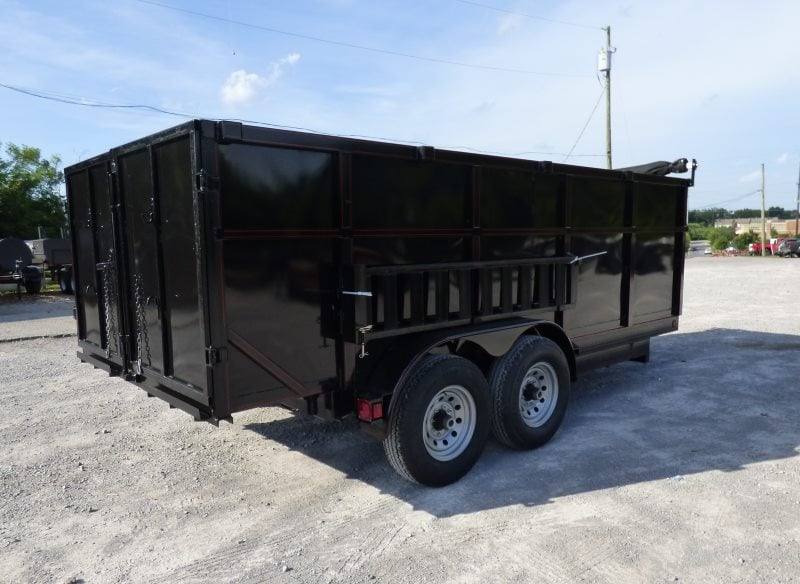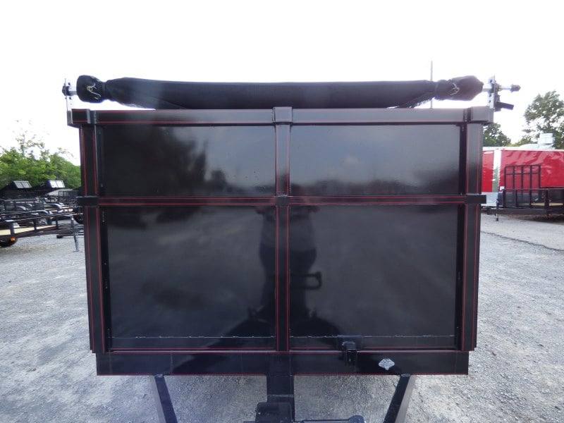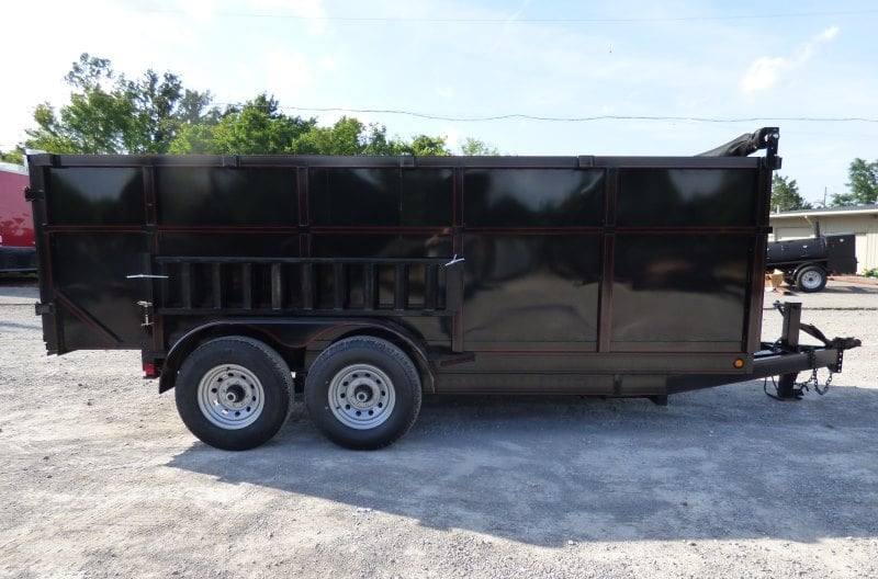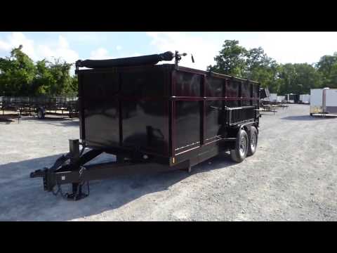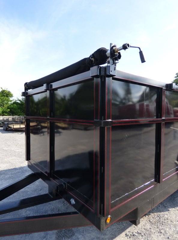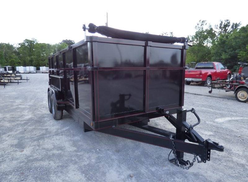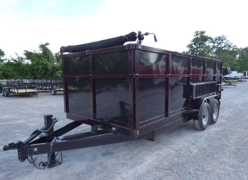 This dump trailer measures 7 ft. by 16 ft and features 4 ft sides, two axles with brakes, loading ramp, a manual tarp kit, two hydraulic cylinders, heavy duty frame and more.