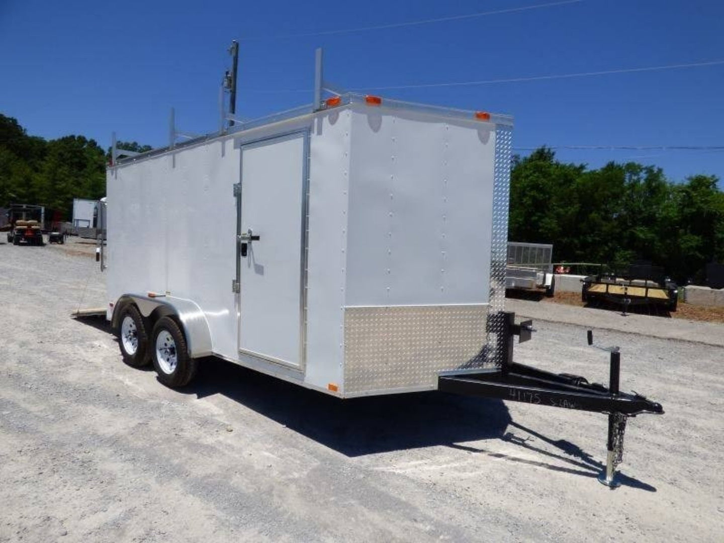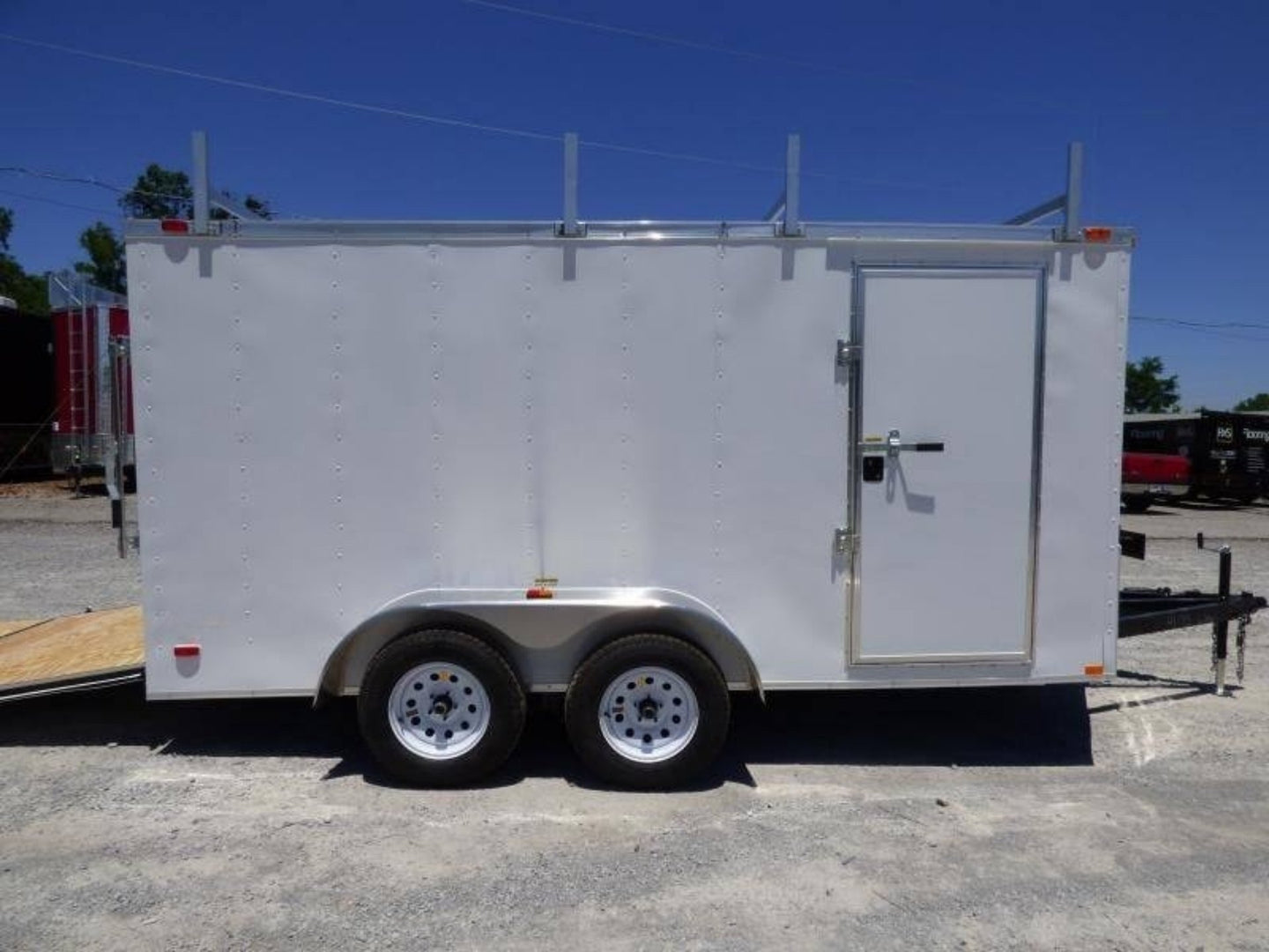 This enclosed trailer measures 7' x 14' and comes in standard white. It features two 3,500 lbs axles, ladder racks on top, interior dome light, 32-inch side door, heavy-duty floor plywood floor, an aluminum exterior with baked enamel finish, a spare tire holder, and more.