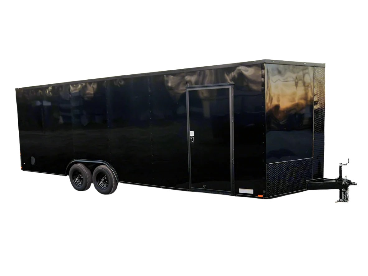 This 8.5x24 Black V-Nose Enclosed Trailer features a bold all-black exterior with a premium blackout trim package and 24" stone guard for maximum durability. Dual 5,200lb greaseable axles and 15" steel wheels with radial tires provide smooth, reliable towing. A spring-assisted rear ramp and 32" side entry door with RV-style lock make loading and accessing cargo simple. The interior includes 3/8" plywood walls, 3/4" commercial-grade flooring, dual vents, and 12V LED lighting for convenience and airflow. Safety is built-in with a breakaway system, jack, adjustable coupler, and safety chains, making it road-ready.