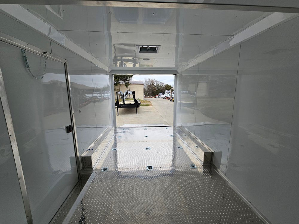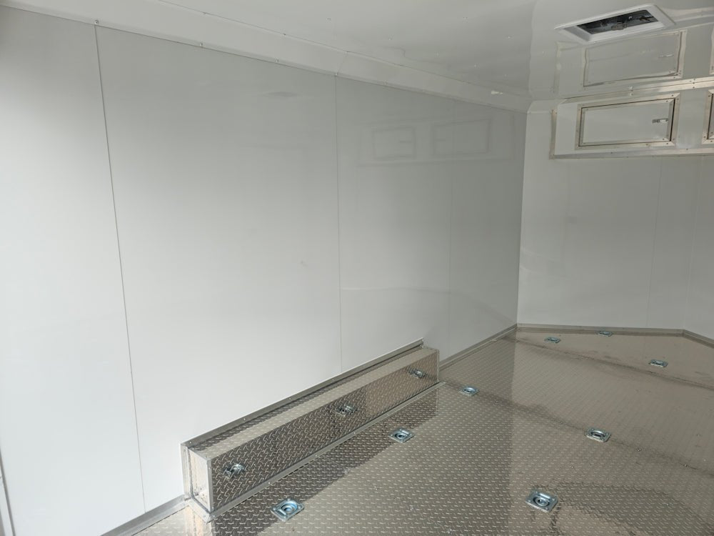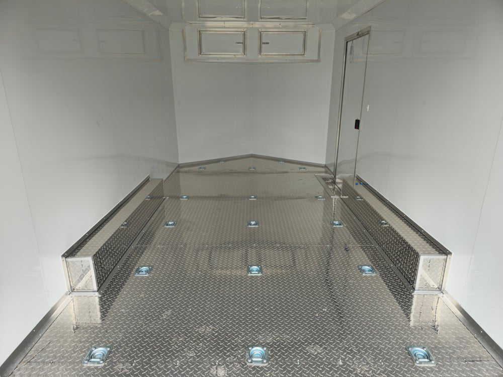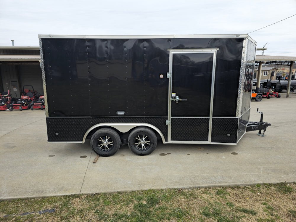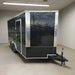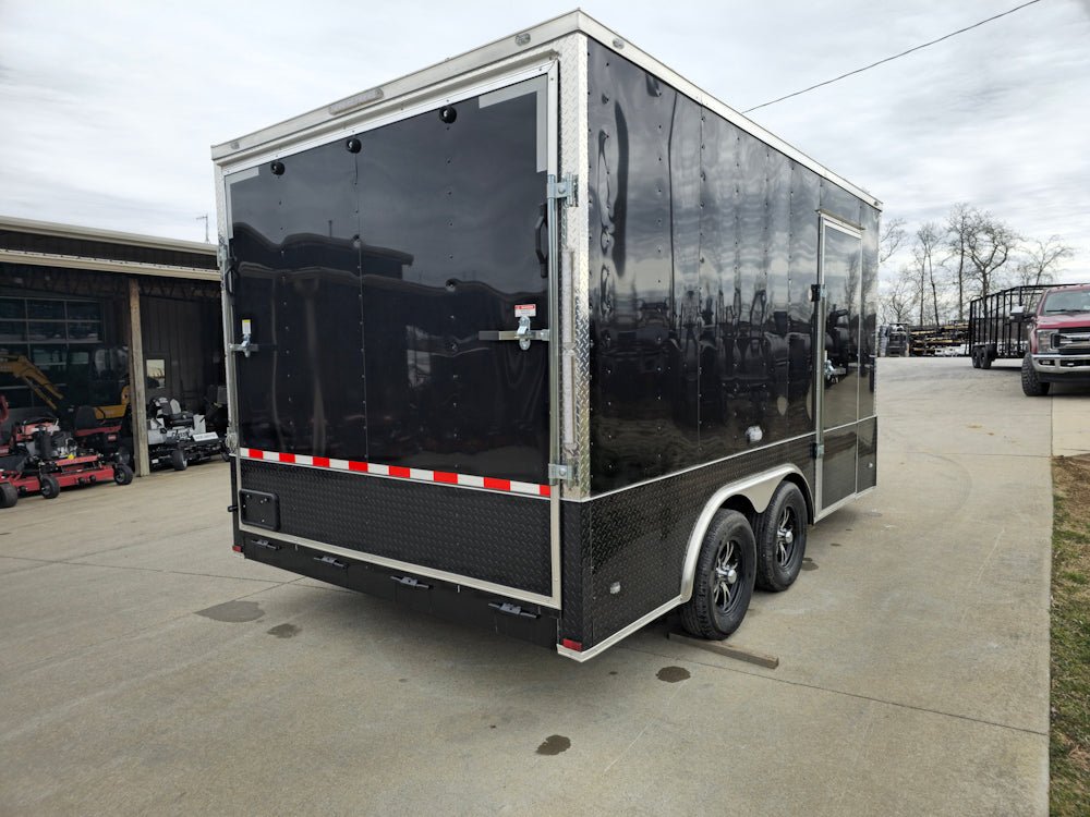This 8.5' x 14' enclosed trailer is built for secure and efficient transport of cars, ATVs, and equipment, featuring a sleek black exterior with black and silver trim for a professional look. Designed for durability and convenience, it boasts heavy-duty 3,500 lb axles with brakes, a spring-assisted rear ramp, and 17 floor-mounted D-rings for maximum stability and security. Inside, the 7' high interior is lined with white aluminum walls, and aluminum tread plate flooring, ensuring a spacious, and durable workspace for all your hauling needs.