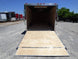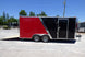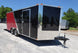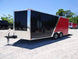 Enclosed trailer that measures 8.5 ft. by 18 ft. and is red and black. It features an interior height of 6 ft. 6 in., 18 ft v-nose design, interior dome light, and more.