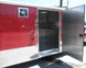 This custom red enclosed trailer is 8.5 ft by 26 ft and features 6 d-rings on the floor, 48 inch side door, A/C with heat strip, upper and lower cabinets across the front, 20 ft awning, light package.
