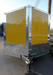 This enclosed trailer is yellow and 8.5 ft by 26 ft. It features 2 110 v outlets, 24 in stone guard, fluorescent interior lighting, side access door, galvanized roof, dual 5,200 lb axles.