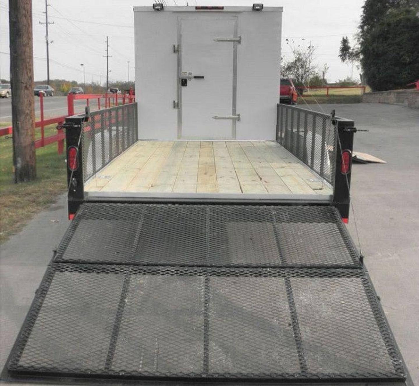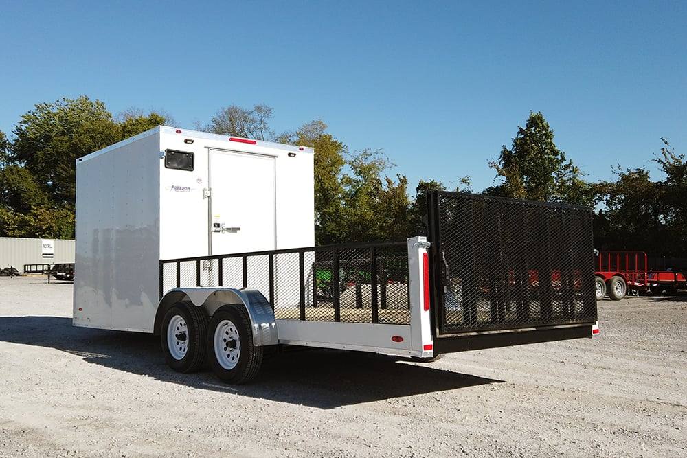 Enclosed section is 8 foot features a v-nose, side ramp, and rear door. Utility section is 12 foot and features mesh sides.