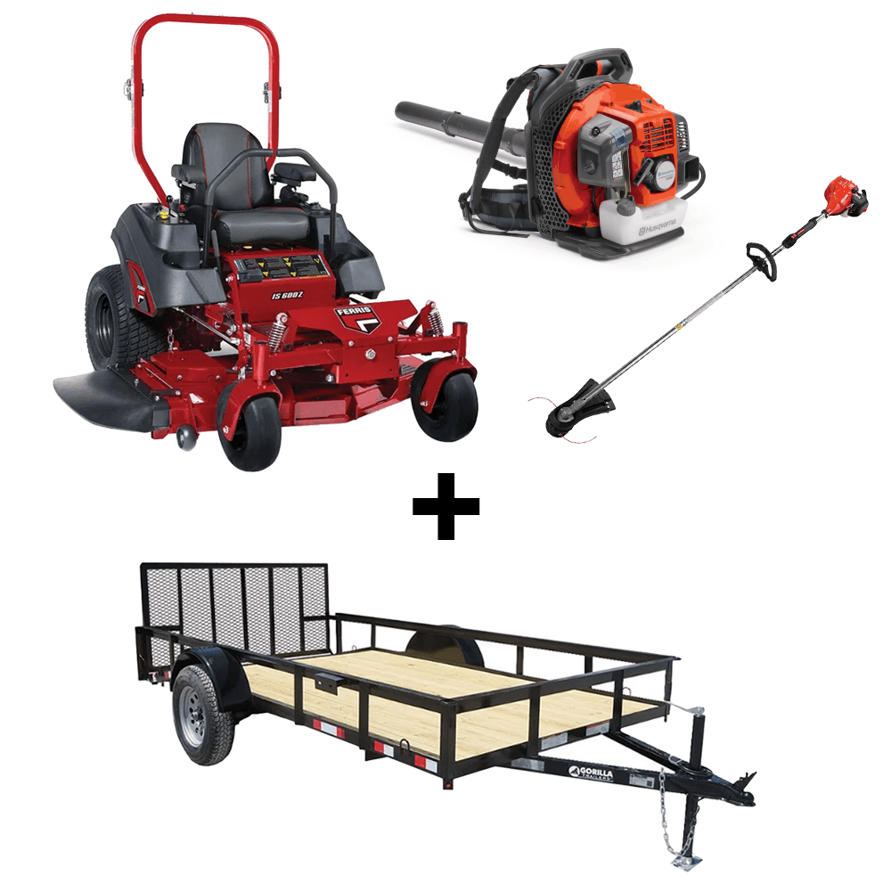 This package includes a 48 inch Ferris IS600 (5902110) zero turn mower with a 25 horsepower Briggs & Stratton engine, an Echo SRM-225-2A string trimmer, an Husqvarna 150BT backpack leaf blower, and a 5x10 utility trailer.