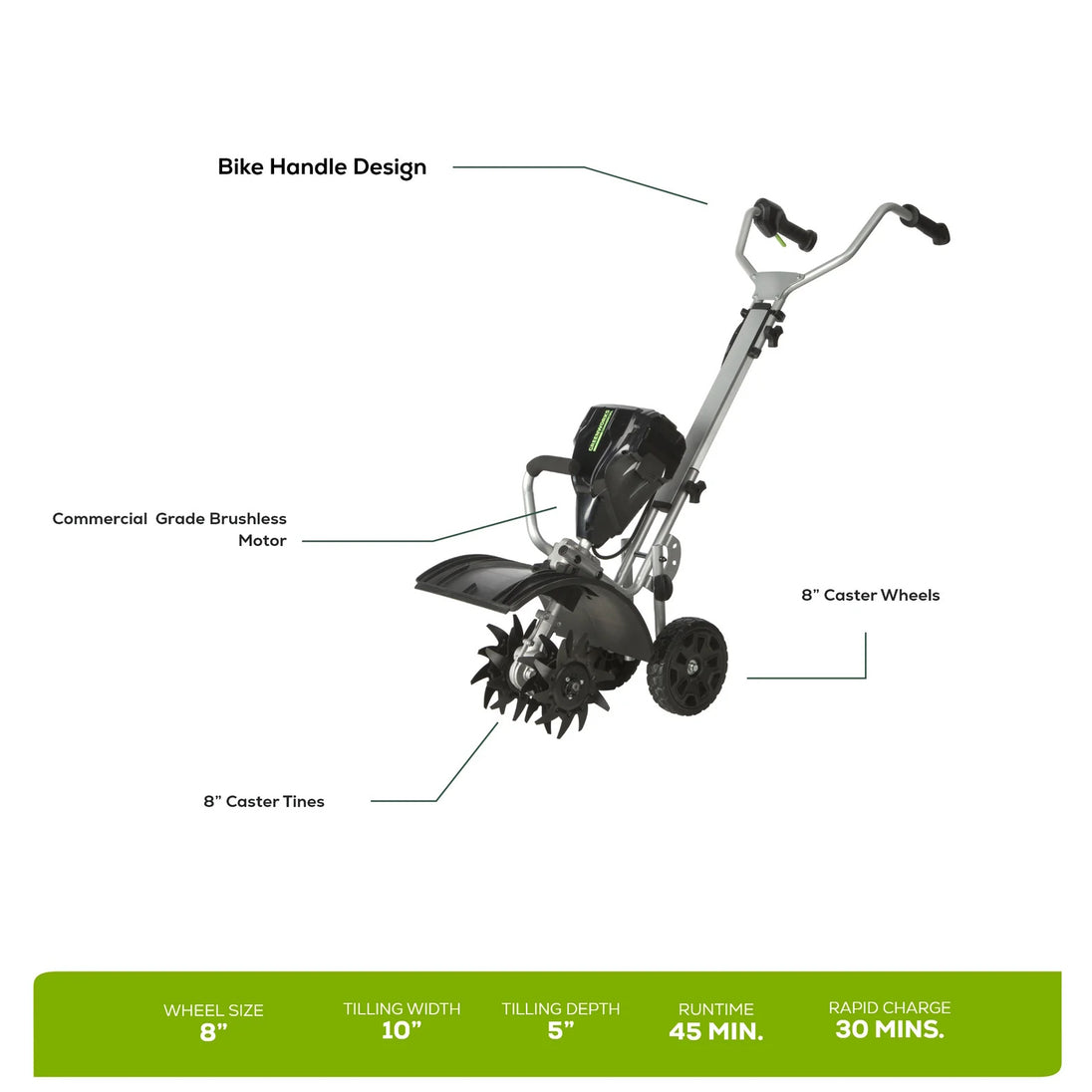The Greenworks GTL100 10” Tiller/Cultivator features an 82V battery-powered brushless motor delivering 25Nm of torque—more than a 25cc gas engine. With a 10” tilling width, 5” depth, and 1,700 SPM speed, it efficiently breaks up tough soil. Its 8” caster wheels ensure smooth maneuverability, and a 5Ah battery (sold separately) provides up to 30 minutes of runtime. Rapidly recharges in just 40 minutes. Battery and charger sold separately.