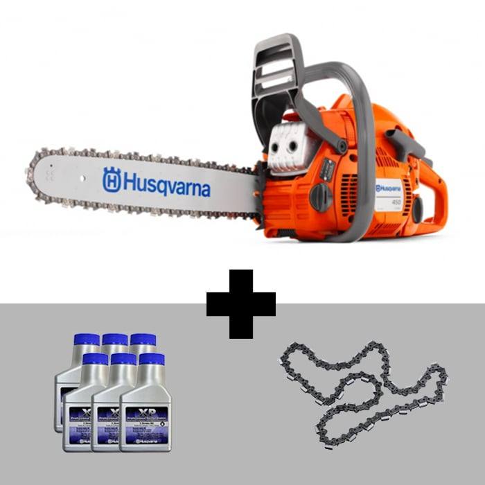 The powerful Husqvarna 450 chainsaw features a 18 inch bar and is powered by a 50.2cc engine. Includes extra chain and Husqvarna 6-pack 2.6 oz. bottle oil.