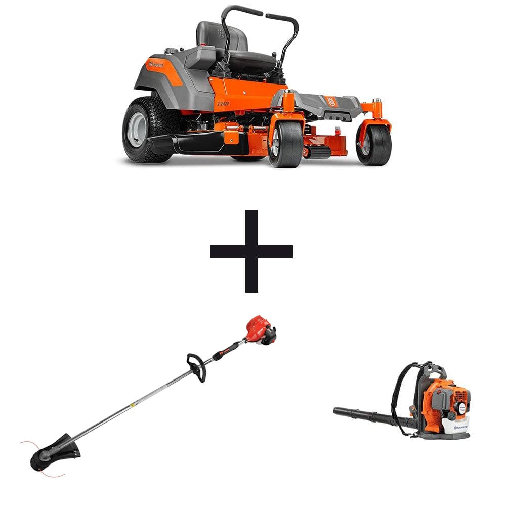 This package features the Husqvarna Z242F zero turn lawn mower with a 18 hp Kawasaki engine, a Husqvarna 129L straight shaft string trimmer, and a Husqvarna 130BT backpack leaf blower.