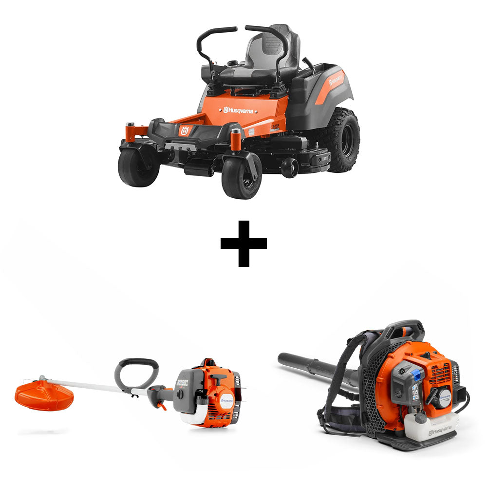 This package includes a Husqvarna Z248F Special Edition 48" zero-turn mower powered by a 21.5HP Kawasaki engine, featuring a durable ClearCut™ deck, smooth performance, and upgraded comfort for efficient mowing. It also comes with a Husqvarna 150BT backpack blower delivering 765 CFM airflow and ergonomic support, along with a lightweight 122L string trimmer designed for easy starting, precision trimming, and extended reach. Together, this setup delivers reliable power and efficiency for professional-quality lawn care and maintenance.