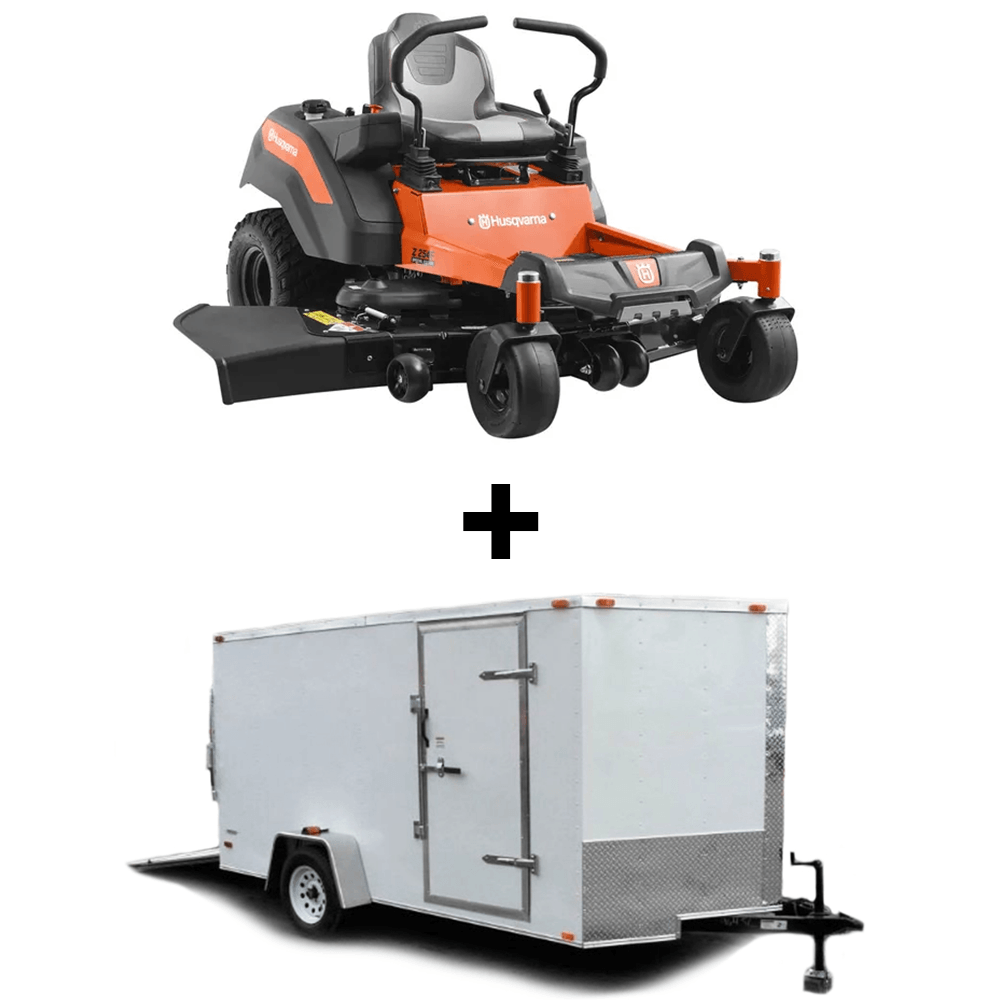 This package includes a 54 inch Husqvarna Z254F (967953804) zero turn mower with a 23-horsepower Kawasaki engine and a 6x12 v-nose enclosed trailer.
