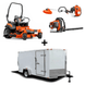 This package includes a commercial 60-inch Husqvarna Z460XS zero-turn mower with a 23.5-horsepower Kawasaki engine, one Husqvarna 350BT backpack blower, one 525L straight-shaft string trimmer, and a 7-foot by 12-foot white enclosed trailer.
