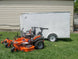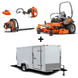 This package includes a commercial 60-inch Husqvarna Z560L zero-turn mower with a 27-horsepower Kawasaki engine, one Husqvarna 350BT backpack blower, one 525L straight-shaft string trimmer, and a 7-foot by 12-foot white enclosed trailer.
