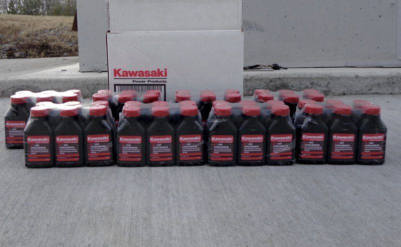 This is a case of 48 bottles of Kawasaki 2-Cycle engine oil. Each bottle is 2.6 oz. and mixes with one gallon of gas.