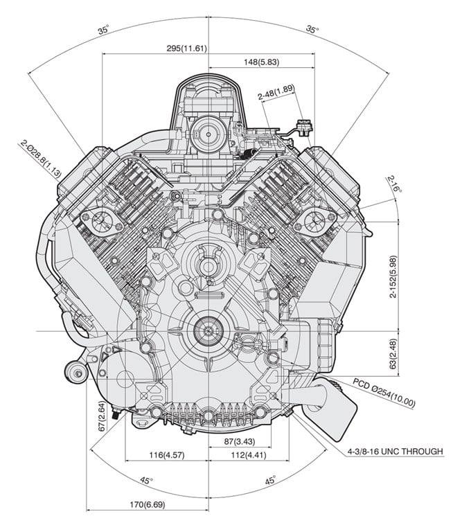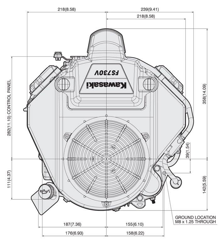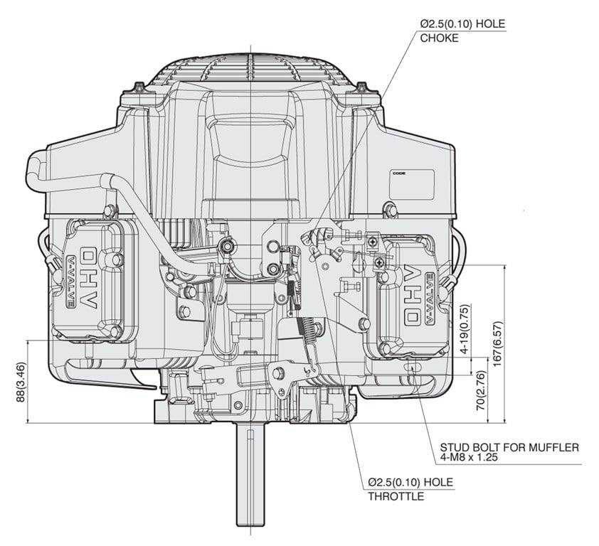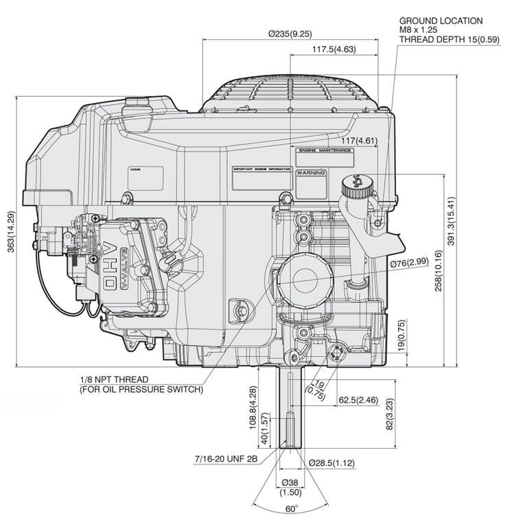 Kawasaki FS651V-DS07S 726cc replacement engine with a vertical shaft measuring 1in. x 3-5/32 in. and 39.4 max torque.