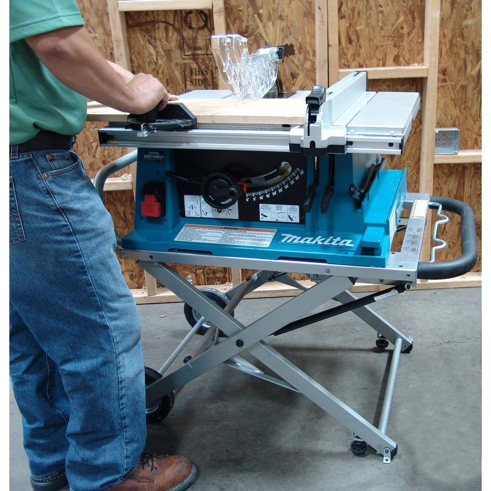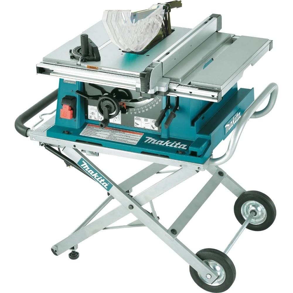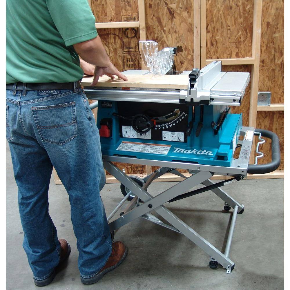 This Makita 2705X1 10 inch Contractor Table Saw Comes with a stand. This product is a precision machined table top for accurate cuts.
