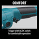 This Makita GA5020Y 5 inch SJS angle grinder, with AC/DC switch combines 10.5 AMP power with comfort and motor-protection features for longer-lasting industrial performance. The GA5020Y is engineered with Makita’s innovative SJS™ mechanical clutch system to protect the gears for longer tool life.