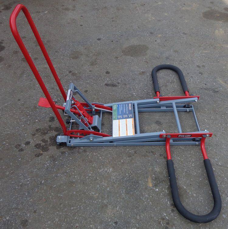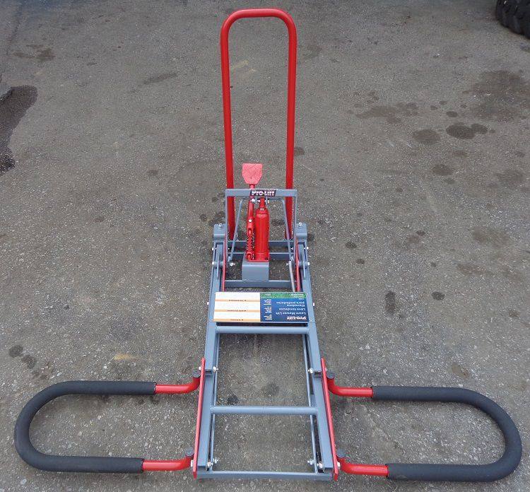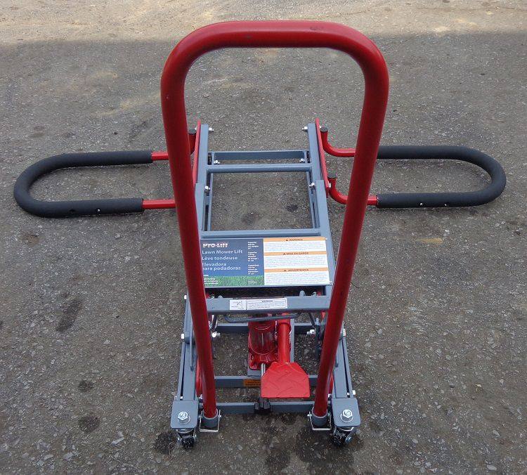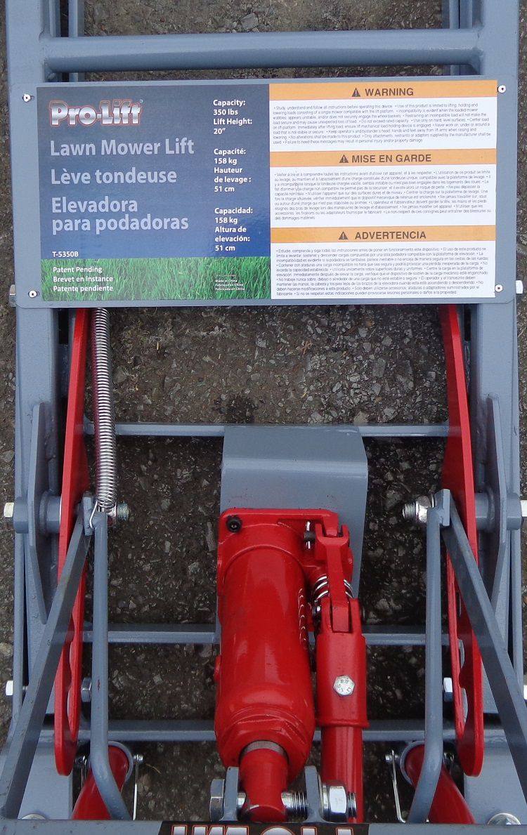 The Pro-Lift T-5350 lawn mower lift is designed for residential lawn mowers. It has a 350 lb lifting capacity and is foot operated with release valve.