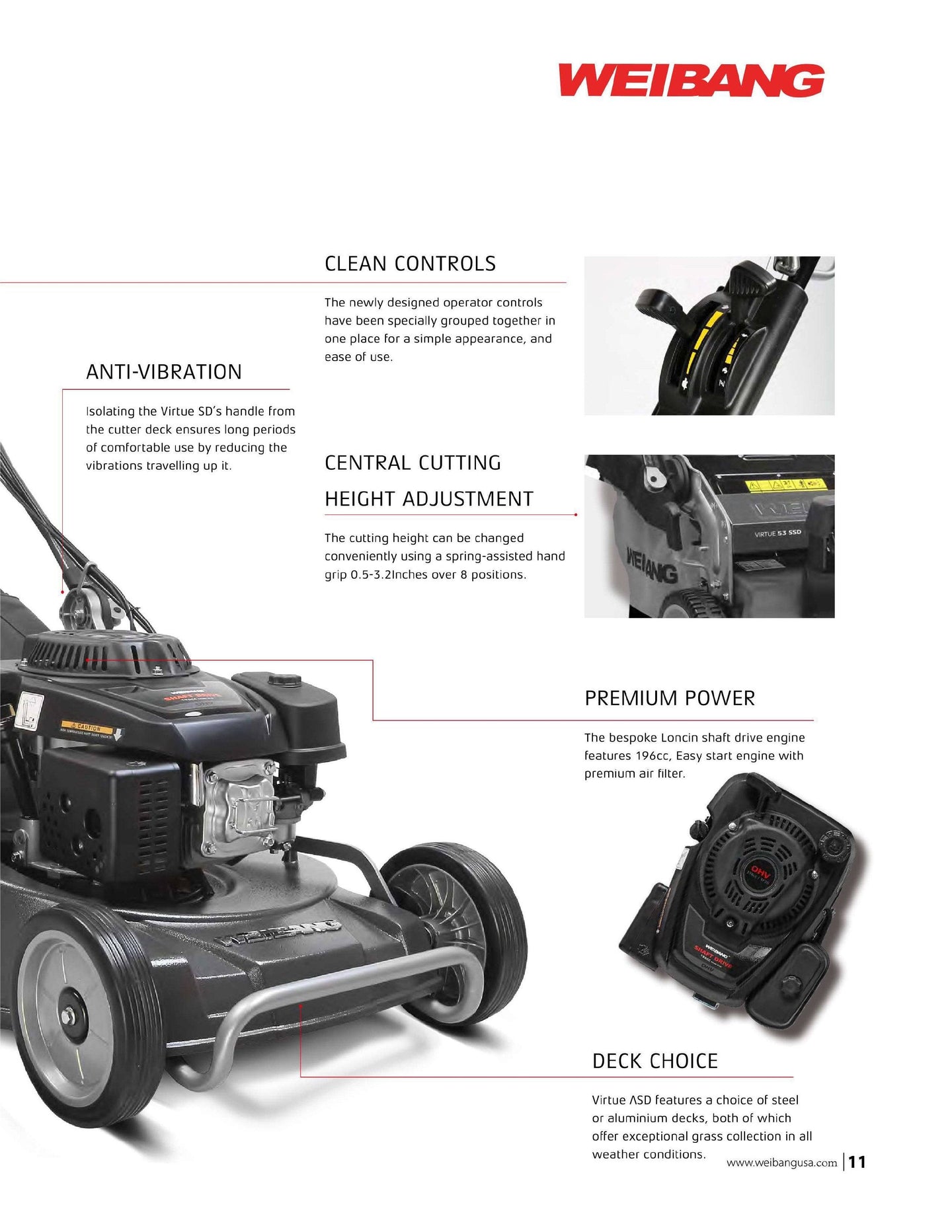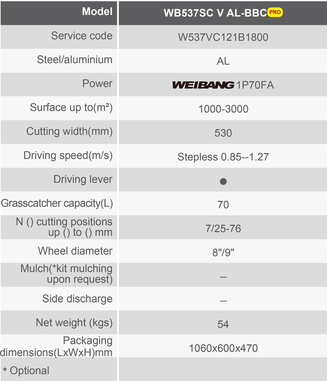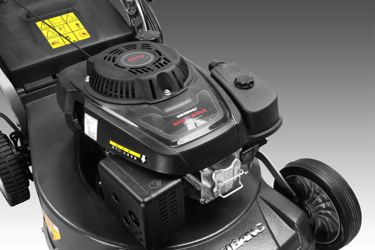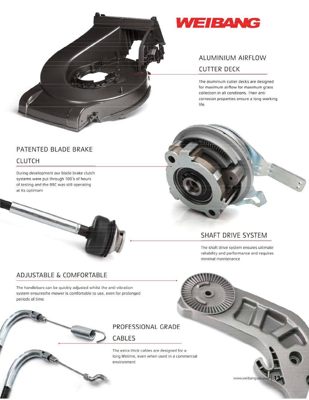 The Weibang WB537SCVAL is a commercial grade 21 inch mower. With a 196cc engine and features shaft drive technology. The aluminum deck is designed to last a lifetime. This unit also features a high airflow design that helps to collect grass clippings in Diverse Weather conditions. This machine was built for maximum reliability and performance. This is a shaft drive unit.
