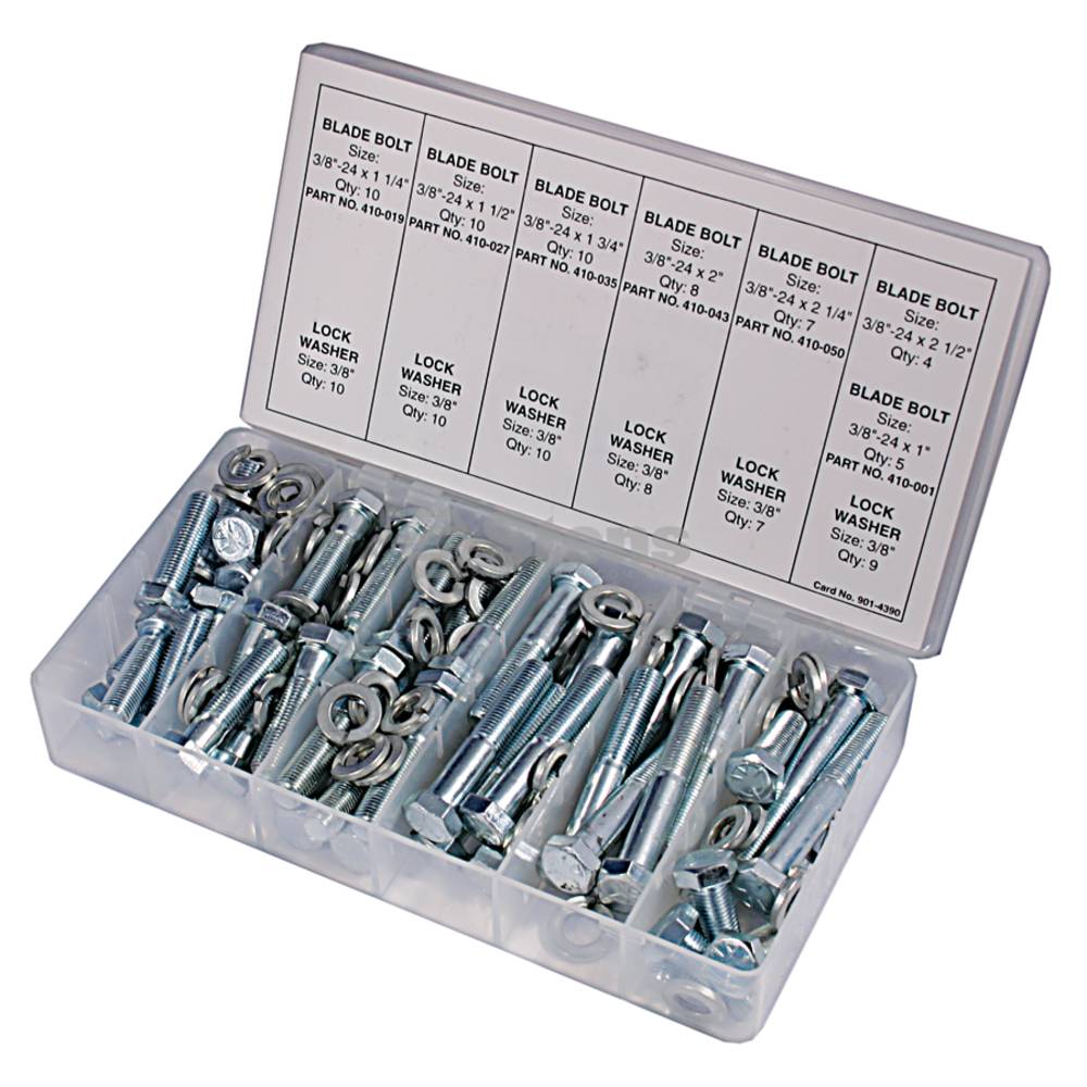 Specifications: Includes: 108 pieces Includes 108 piecesIncludes the following:4 of 3/8"-24 x 2 1/2"5 of 3/8"-24 x 1"7 of 3/8"-24 x 2 1/4"8 of 3/8"-24 x 2"10 of 3/8"-24 x 1 1/4"10 of 3/8"-24 x 1 1/2"10 of 3/8"-24 x 1 3/4"54 of 3/8" lock washersGrade 5