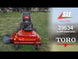 The Toro 39634 Pistol Grip Walk-Behind Mower features a 36-inch TURBO FORCE fixed deck, rubber discharge chute for durability, and is powered by a 14.5HP Kawasaki FS engine.