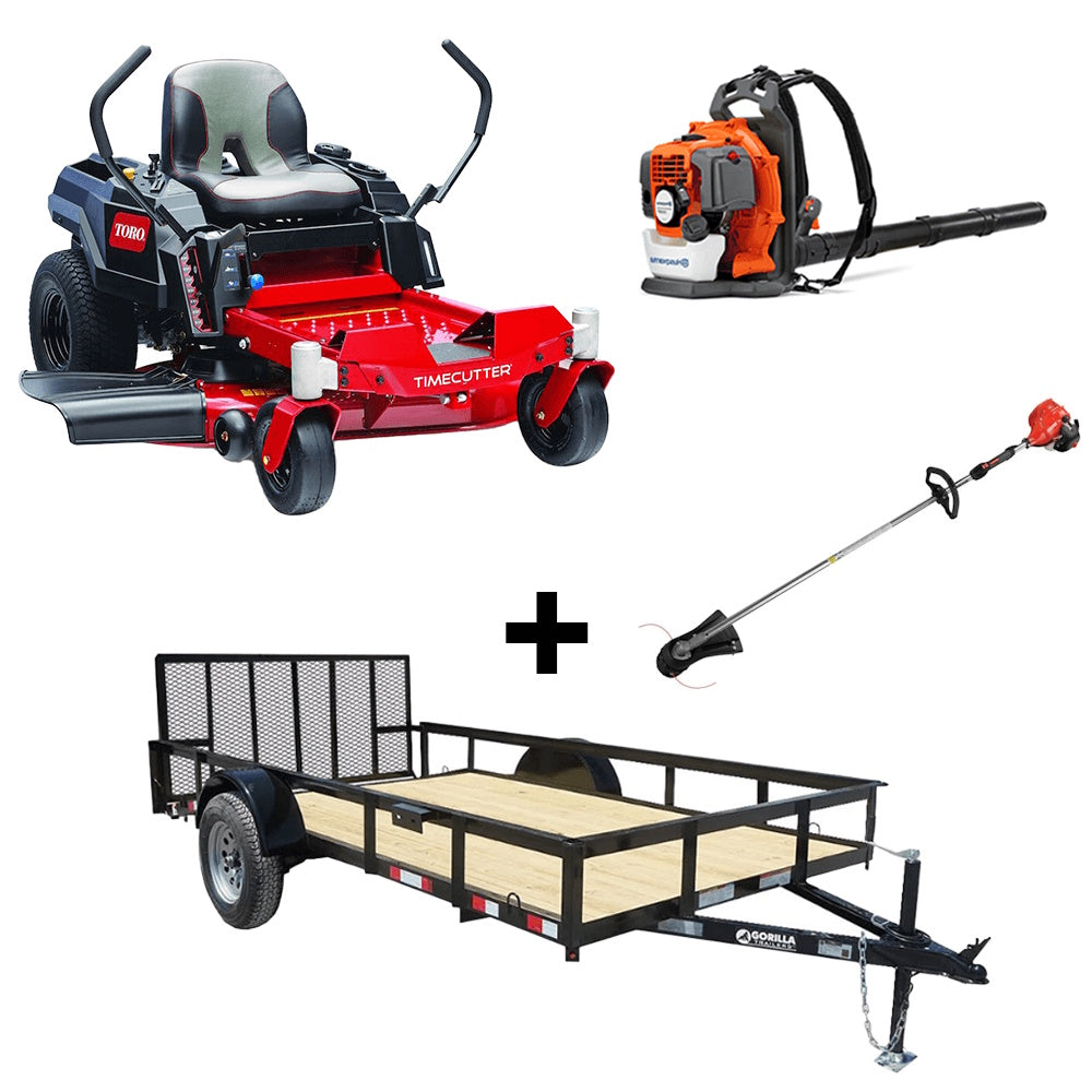This package includes a 42”-inch TimeCutter (75748) Zero Turn Mower powered by a 15.5-horsepower Briggs and Stratton engine, one Husqvarna 130BT backpack blower, one 128LD straight-shaft string trimmer, and a 5x10 utility trailer.