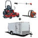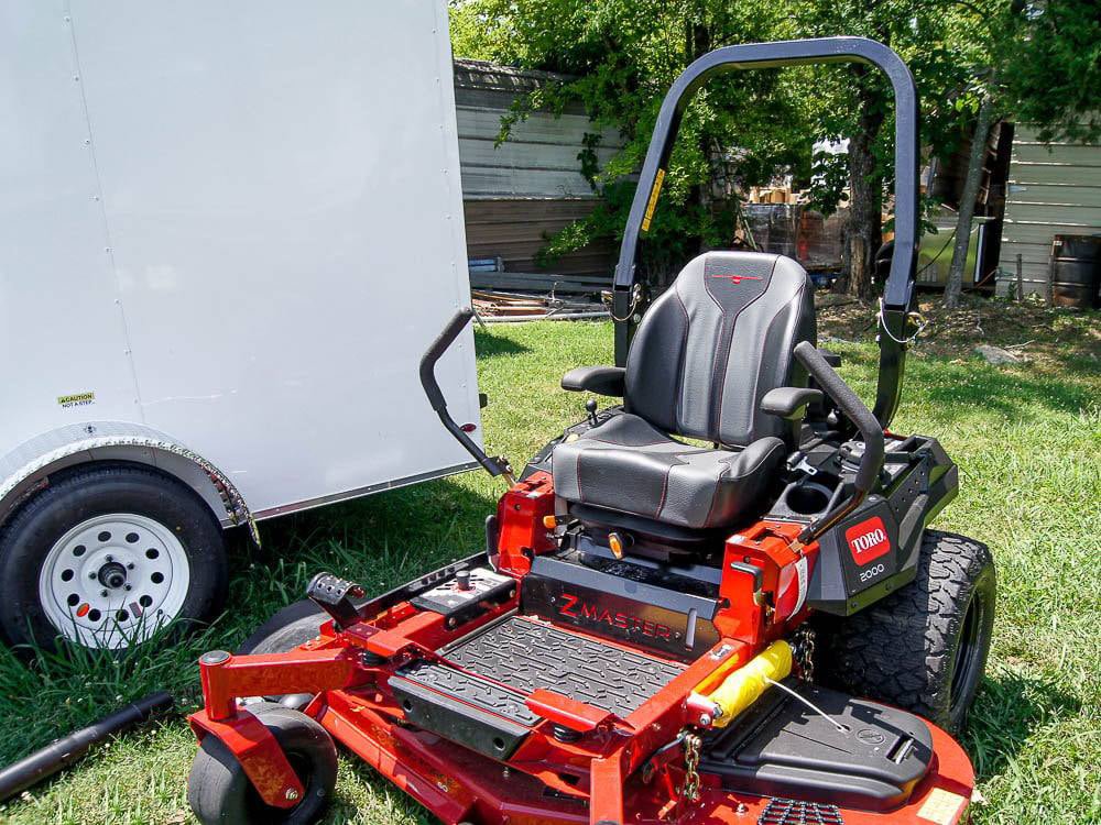 This package includes a 60-inch Toro ZMaster 2000 Series zero-turn mower with a 24.5-horsepower Toro engine, one Husqvarna 130BT backpack blower, one 128LD straight-shaft string trimmer, and a 7-foot by 12-foot white enclosed trailer.